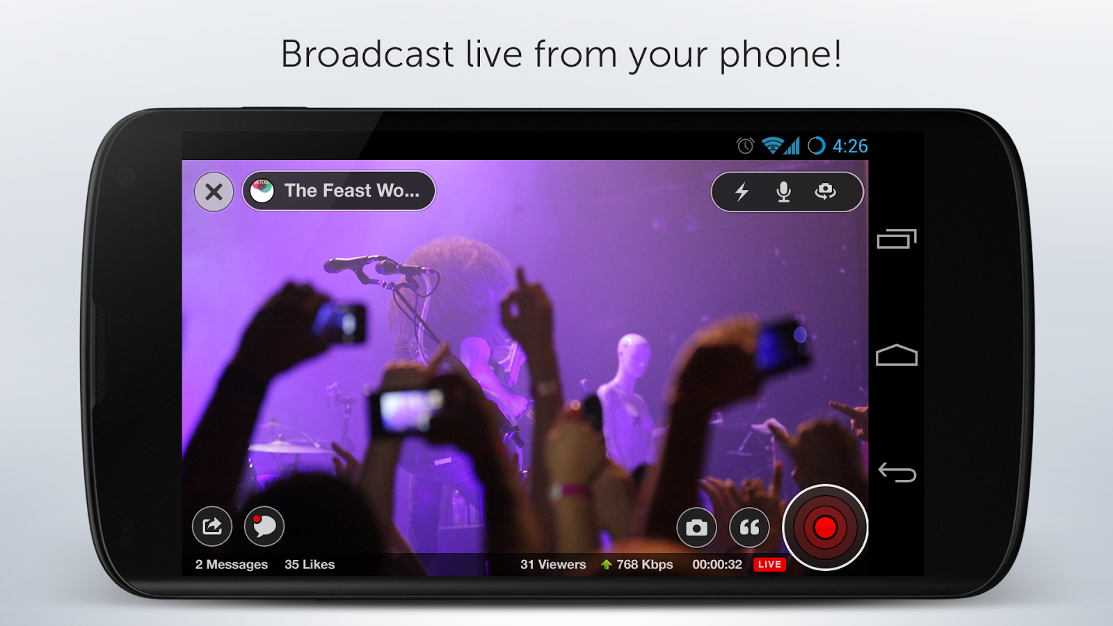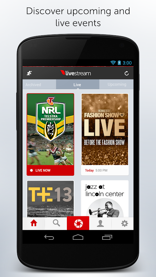 Livestream is the premiere place to WATCH LIVE EVENTS and BROADCAST LIVE from your Android phone. Follow your friends and favorite celebrities, teams, musicians, brands, organizations, events and more to get notified when they go live. Find new live and upcoming events from the accounts you follow daily.